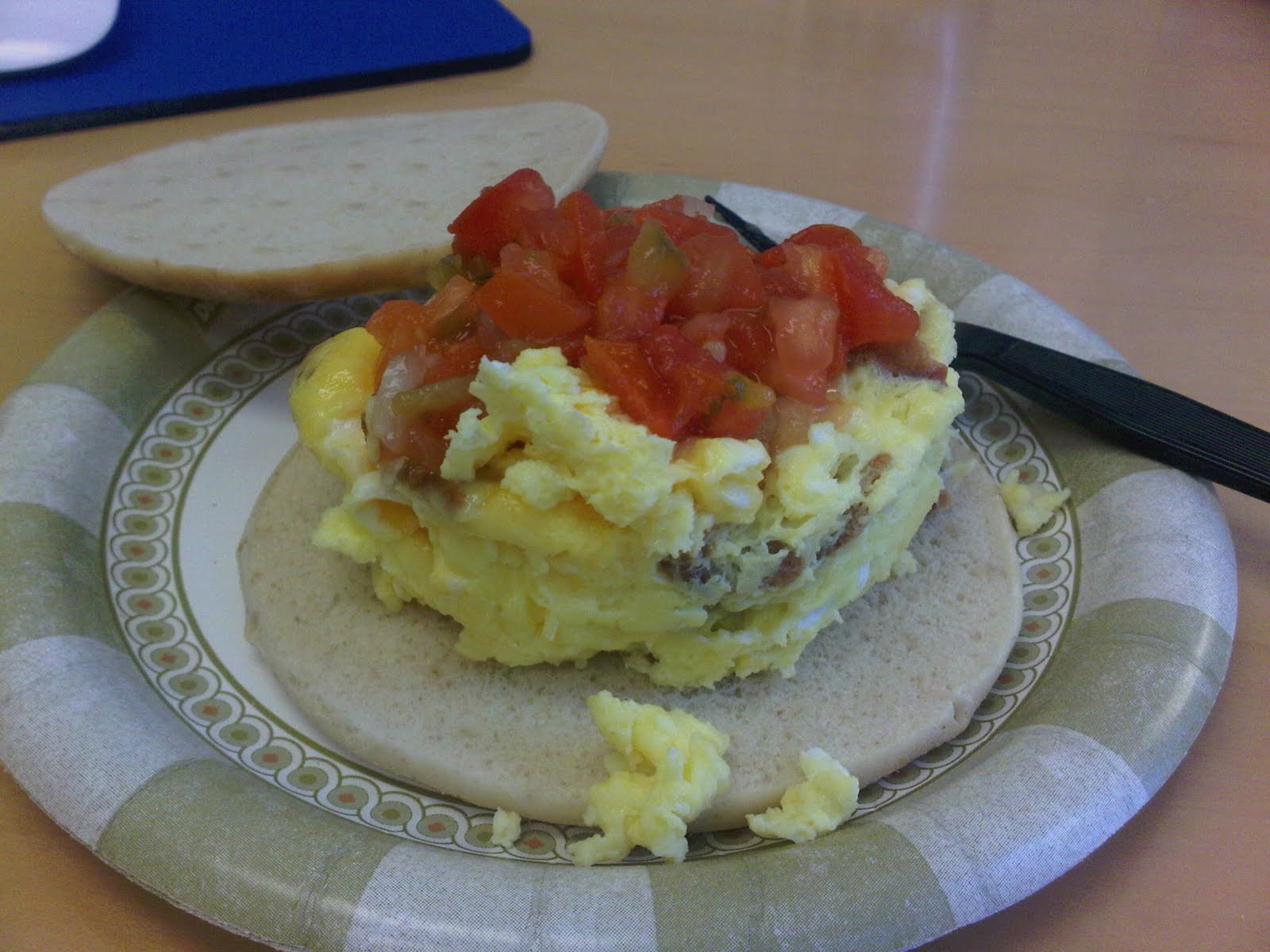 Here's the quickie recipe ... if you can even call it that! In the morning, crack two eggs in a little circular tupperware with a tight lid. When you are ready to eat later, mix up the eggs with a fork, and crumble in one strip of cooked bacon and 1 Tbsp. shredded cheese. Microwave with no lid for about 45 seconds until the eggs have fluffed up. Use a fork to pop it out of the container, and place it onto a sandwich round. Top with leftover salsa.